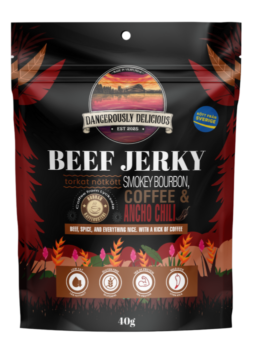 Beef from Norrland, Tamari sauce (water, soybeans*, sea salt, alcohol, Koji ferment [Aspergillus oryzae]), apple cider vinegar, dark syrup, coffee from Budhas Kafferosteri, Bourbon whiskey, garlic powder, onion powder, paprika, ancho chili, curing salt (salt, sodium nitrite), fish sauce (anchovies*, salt, sugar), mustard powder*, liquid smoke (water, hickory smoke aroma).