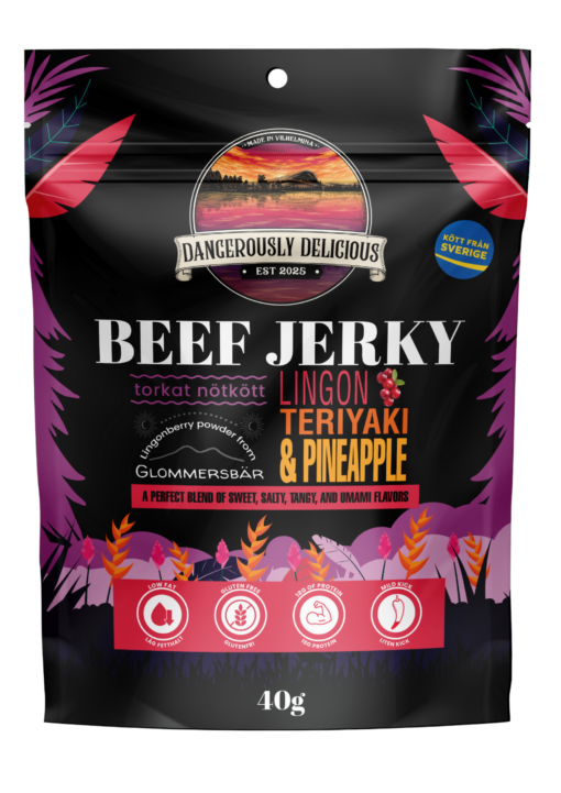 Pineapple, zesty ginger, and savory teriyaki meet tart lingonberries from Norrland — creating a bright, tender jerky with a sweet finish and a hint of spice.
