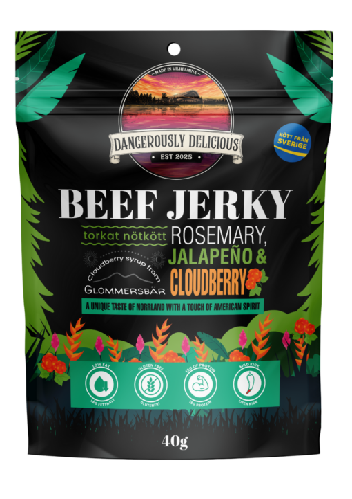 Beef from Norrland, Tamari sauce (water, soybeans*, sea salt, alcohol, Koji ferment [Aspergillus oryzae]), apple cider vinegar, cloudberry syrup (cloudberry juice, sugar), jalapeño chili, rosemary, garlic, cloudberry powder, onion powder, curing salt (salt, sodium nitrite), fish sauce (anchovies*, salt, sugar), black pepper.
